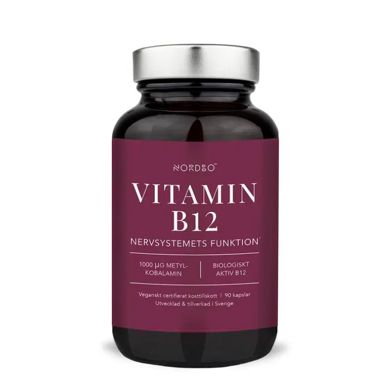 NORDBO B12 е хранителна добавка с високо съдържание на витамин B12, съдържаща 1000 µg метилкобаламин от веган произход.